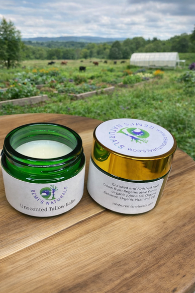 • Grass-Fed & Finished Beef Tallow (from regenerative farms) – Rich in vitamins A, D, E, and K; deeply nourishes, supports skin repair, and promotes a healthy glow